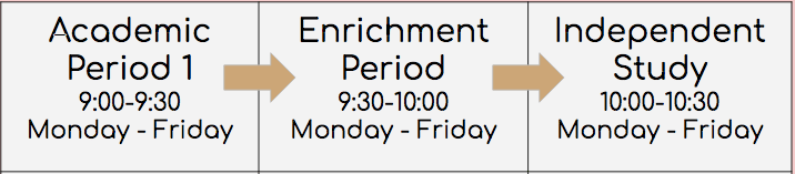So, the Academic period is either Math/ELA, then Enrichment would be Nutrition/Art/PE (depending on grade level), and Independent Study would be time for students to work by themselves and ask any specific questions about assignments. Really, Independent Study is an office hour but also a 30 minute period where students can recharge for Academic Period 2.